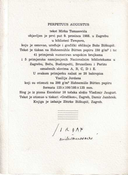 Tekst Mirka Tomasovića objavljen je prvi put 9. prosinca 1988. u Zagrebu u biblioteci Tempora, koju je osnovao, uređuje i grafički oblikuje Božo Biškupić.