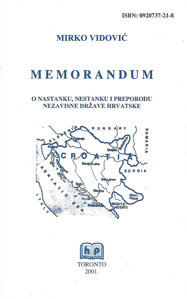 Posljednjih sam mjeseci imao malo nezahvalnijih zadaća od prikaza knjižice Mirka Vidovića Memorandum o nastanku, nestanku i preporodu Nezavisne Države Hrvatske (III + 37 str.) što ju je u nakladi od 1000 primjeraka 2001. u Torontu, “uz potporu Hrvata iz južnog Ontarija” tiskao Hrvatski put, s predgovorom Rudija Tomića.