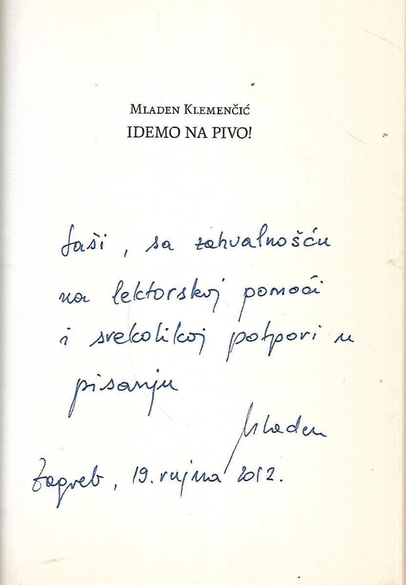 Zapisi Mladena Klemenčića Idemo na pivo! svojevrstan su pivski putopis u kojem autor prema zemljopisnom ključu priča priču o pivu i to kako o njegovoj proizvodnji tako i o kulturi ispijanja piva u pojedinoj zemlji. Izbor piva i pivnica sasvim je osoban a autor želi raspraviti neke stereotipe u vezi s pivom, ispričati zanimljive pričice koje stoje u pozadini pojedinih pivskih naziva, znakova i simbola, ukazati na širi kulturološki aspekt pivarstva i potrošnje piva, a naposljetku i preporučiti neke manje poznate pivske vrste, kao i mjesta u različitim zemljama i gradovima gdje se može popiti dobro pivo i osjetiti prava pivnička atmosfera.