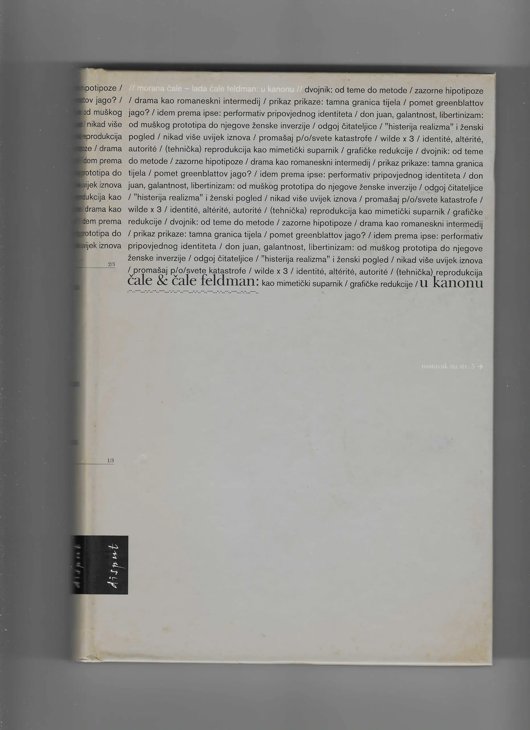 Knjiga je podijeljena u nekoliko segmenata. U odjeljku s naslovom “Riječ i slika, dvojnice” nalazi se studija Zazorne hipotipoze (usporedba metapoetičkih veza djela L. Pirandella Candelora i E. A. Poa Ovalni portret), zatim Drama kao romaneskni intermedij koja promatra Krležin Banket u Blitvi i djelo V. Woolf Između činova, te studija Prikaz prikaze: tamna granica tijela koja analizira Meštrovićeve ilustracije Danteova Pakla. U segmentu “Dvojnikov identitet” nalaze se studije Pomet Greenblattov Jago? (Marin Držić, Dundo Maroje), Idem prema ipse (Miroslav Krleža, Na rubu pameti i Luigi Pirandello, Jedan, nijedan i sto tisuća). U odjeljku “Žena gledateljica/čitateljica” nalaze se studije Odgoj čitateljice, koja se bavi profiliranjem ženskih likova i međuspolnih odnosa u djelu N. Tommasea Odgoj žene u braku i djelu Jean-Jacquesa Rousseaua Nova Heloiza, te studija Histerija realizma i ženski pogled koja analizira ženske likove u Begovićevu Pustolovu pred vratima s pozicija freudeovskih i postfreudovskih psihoanalitičkih koncepcija.