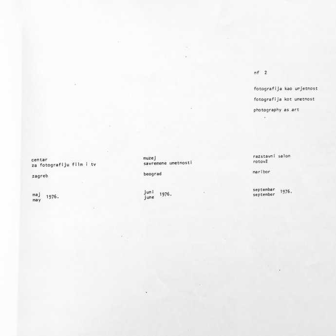 NF 2, fotografija kao umjetnost. Centar za fotografiju film i tv, Zagreb 05.1976., Muzej savremene umjetnosti Beograd, 06.1976. Razstavni salon Rotovž, Maribor, 09.1976.