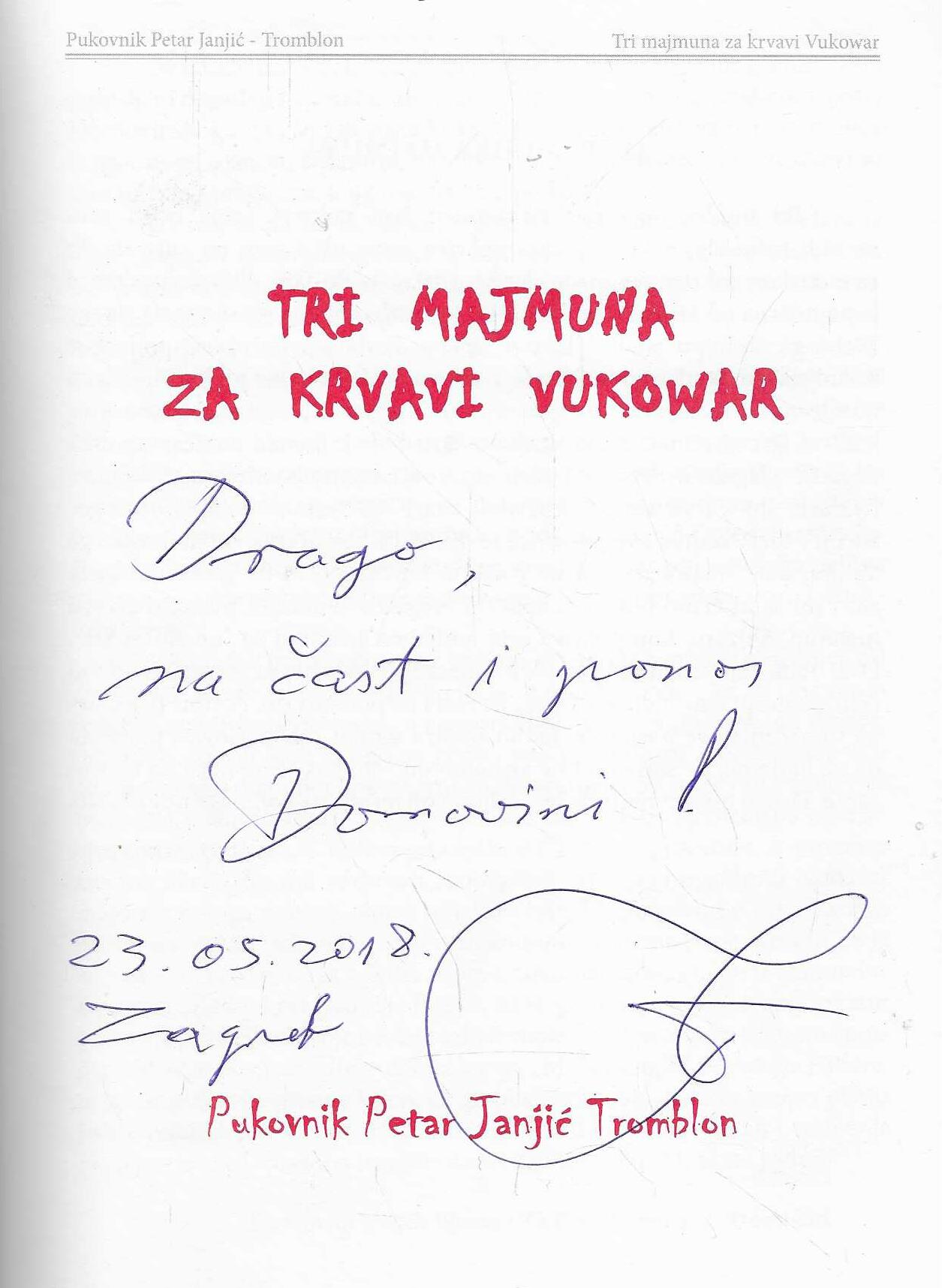 Umirovljeni pukovnik HV-a, Petar Janjić – Tromblon, nakon vrlo uspješne knjige “Žedni krvi, gladni izdaje”, objavio je i svoj drugi ratni roman “Tri majmuna za krvavi Vukowar”: