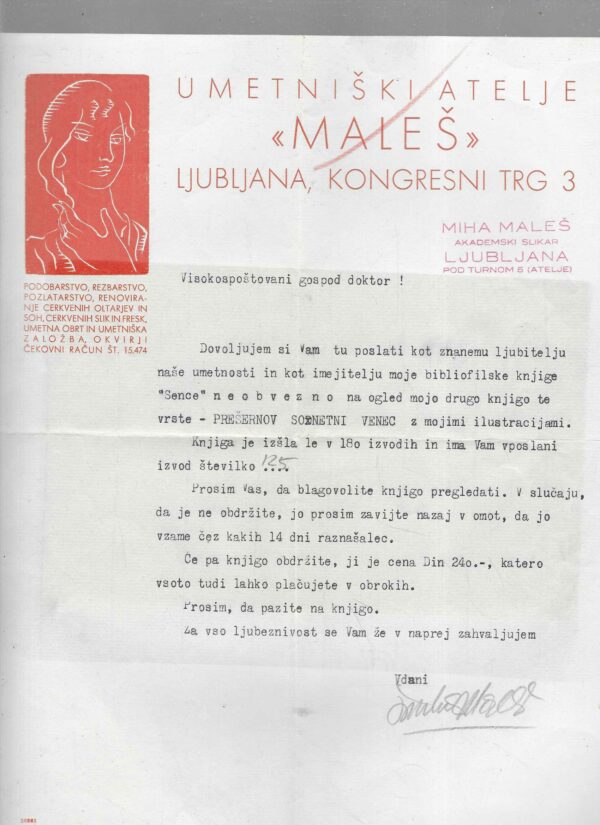 Poslovni dopis, točnije pismo s memorandumom umjetničkog ateljea “Maleš” iz Ljubljane, s adresom Kongresni trg 3.