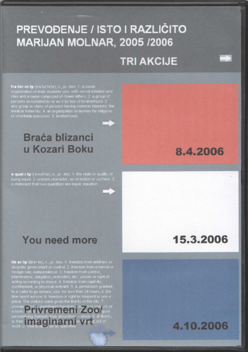 Plakat: – Braća blizanci u Kozari Boku … drugi neka govori. Marijan Molna. Plakat za javnu projekciju 08.04.2006. u Društvenom domu Kozari Bok. Katalog + plakat + CD.