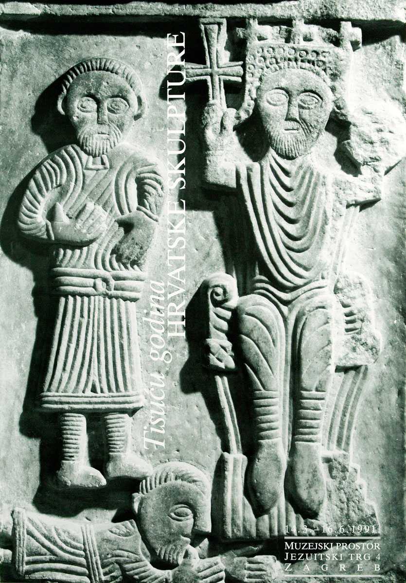 Plakat – Tisuću godina Hrvatske Skulpture. Muzejski prostor, Zagreb. 14.03.-16.06.1991. izložba, skulptura, baština, Hrvatska