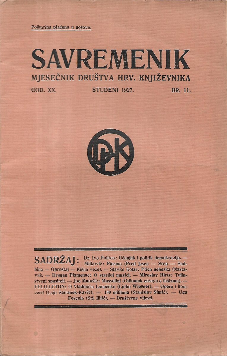 Savremenik 11/1927 – Mjesečnik Društva hrvatskih književnika