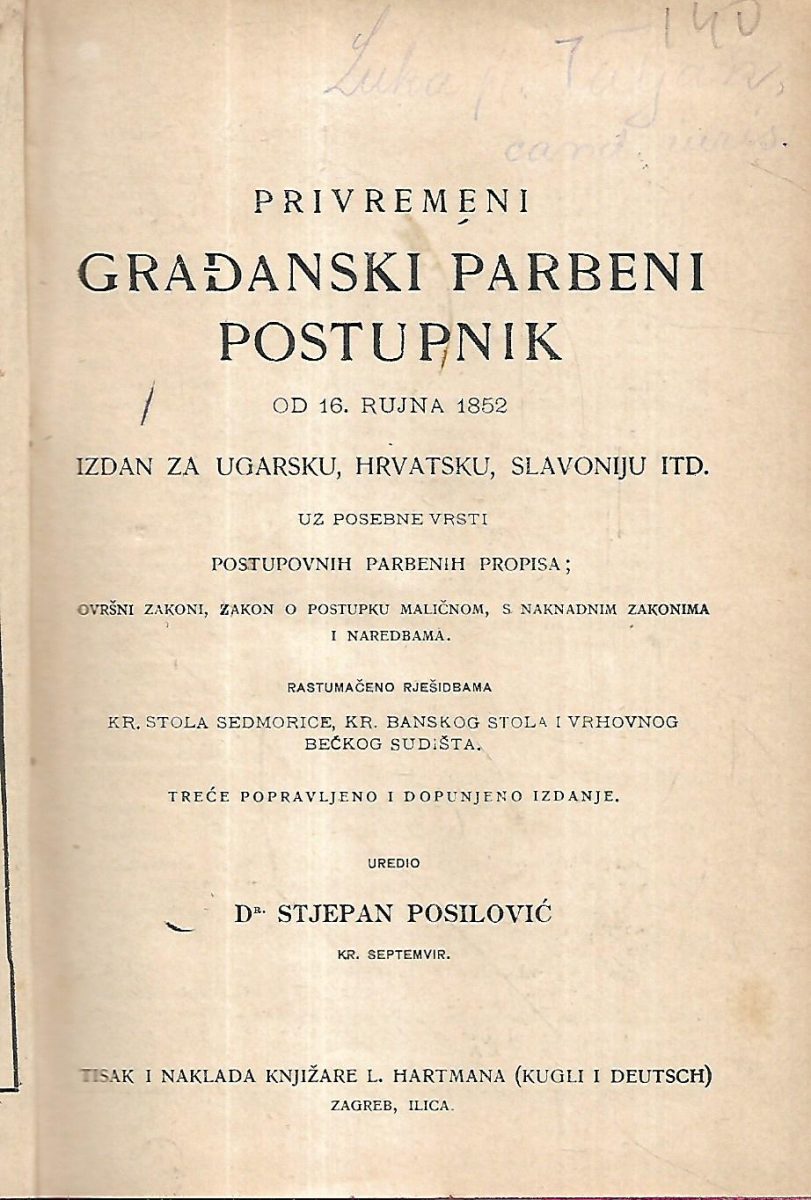 Izdan za Ugarsku, Hrvatsku, Slavoniju itd. : uz posebne vrsti postupovnih parbenih propisa; ovršni zakoni, zakon o postupku maličnom, s naknadnim zakonima i naredbama : rastumačeno rješidbama Kr. stola sedmorice. Kr. banskog stola i Vrhovnog bečkog sudišta