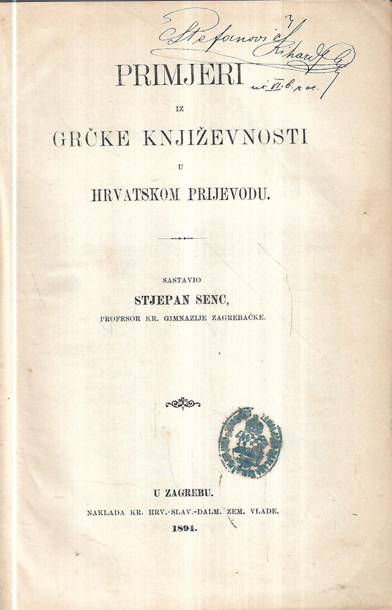Stjepan Senc: Primjeri iz Grčke književnosti u hrvatskom prijevodu