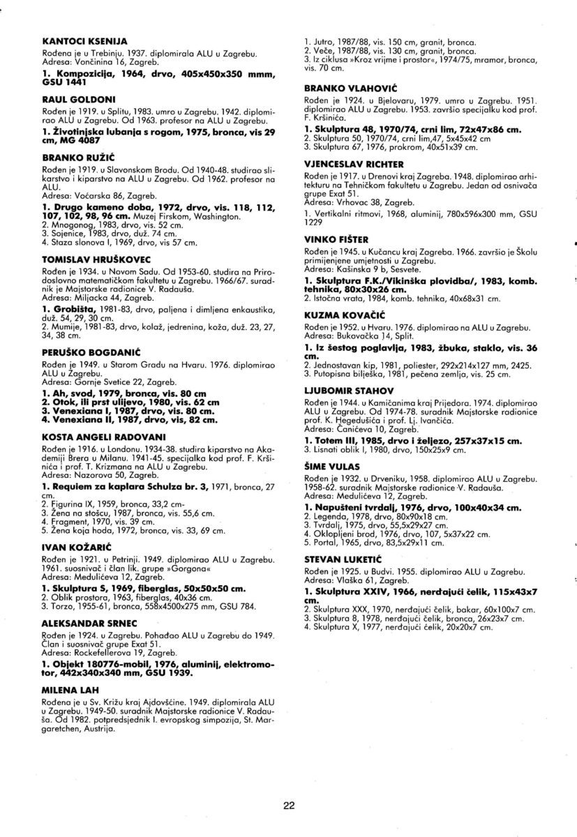 Umjetnici: Kantoci Ksenija, Raul Goldoni, Branko Ružić, Tomislav Hruškovec, Peruško Bogdanić, Kosta Angeli Radovani, Ivan Kožarić. Aleksandar Srnec, Milena Lah, Branko Vlahović, Vjenceslav Richter, Vinko Fišter, Kuzma Kovačić, Ljubomir Stahov, Šime Vulas, Stevan Luketić.