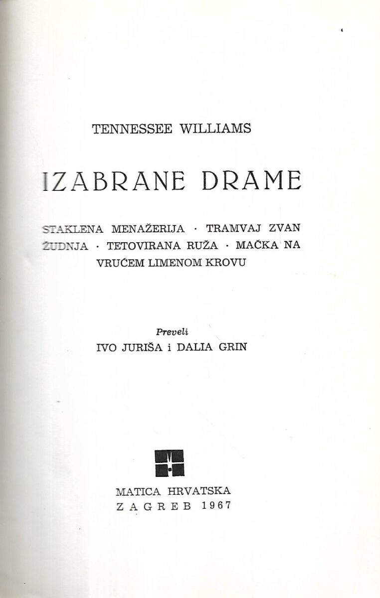 Tennessee Williams : Izabrane drame – Staklena menažerija, Tramvaj zvan žudnja, Tetovirana ruža, Mačka na vrućem limenom krovu