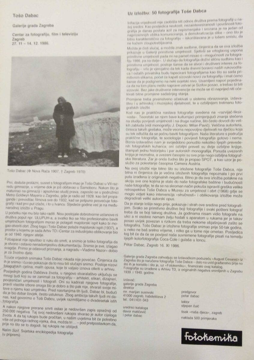 Tošo Dabac: katalog/plakat, 27.11.-14.12.1986. katalog/plakat u odličnom stanju, tiskan je u 500 primjeraka.