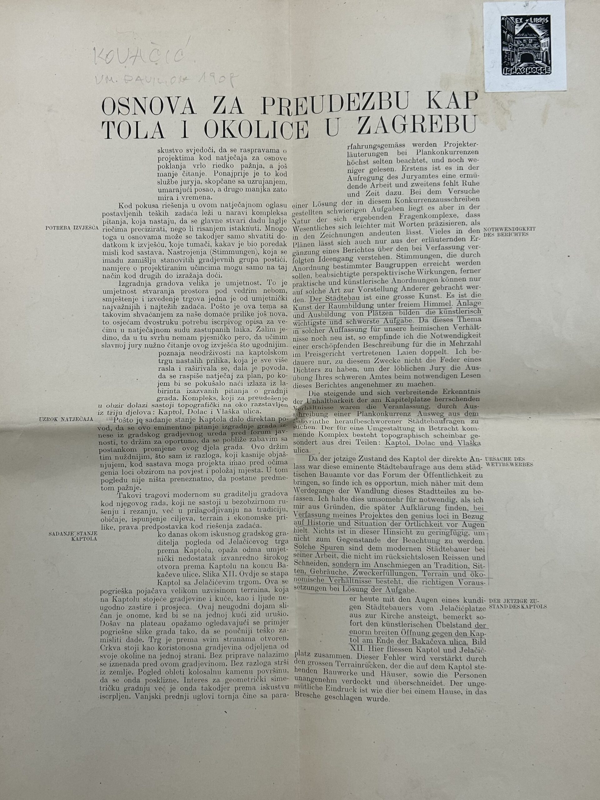 - Publikacija: Svoju je viziju Kovačić objavio 1908. godine u obliku knjižice od 8 stranica pod istim naslovom, u kojoj je detaljno obrazložio svoje urbanističke zamisli.