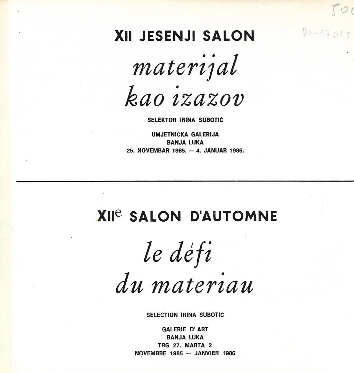 Uperiti svetlo na materijal kao na razlog umetničkog dela, i čitave jedne izložbe, miže se za trenutak učiniti hladnim i odviše racionalnim stavom, pre svega u mislima onih koji neguju ubeđenje da materijal ne određuje poetiku dela. Pri tome samo oni znatiželjnici među stvaraocima (ali i među drugima) znaju da taj terminus tehnicus podrazumeva neiscrpno polje mogućnosti izraza, a pre svega organsko, intimno, duboko vezivanje umetnika za svoj izbor, bez pretjerivanja neiscrpno – kao što je to sam stvaralački čin i neponovljivi proces rada. U tom smislu XX vek je svojim dinamičnim tehnološkim razvojem i izmenjenim teorijskim pristupima u velikoj meri izmenio svet, transponujući u ranije kulturne slojeve novu i – moglo bi se reći – po čoveka fatalnu industrijsku proizvodnju… Tako je metafizika materijala (ali i njena fizika) naše doba otvorila nebrojene mogućnosti novih konfrontacija ljudskog razuma i mašte…”
