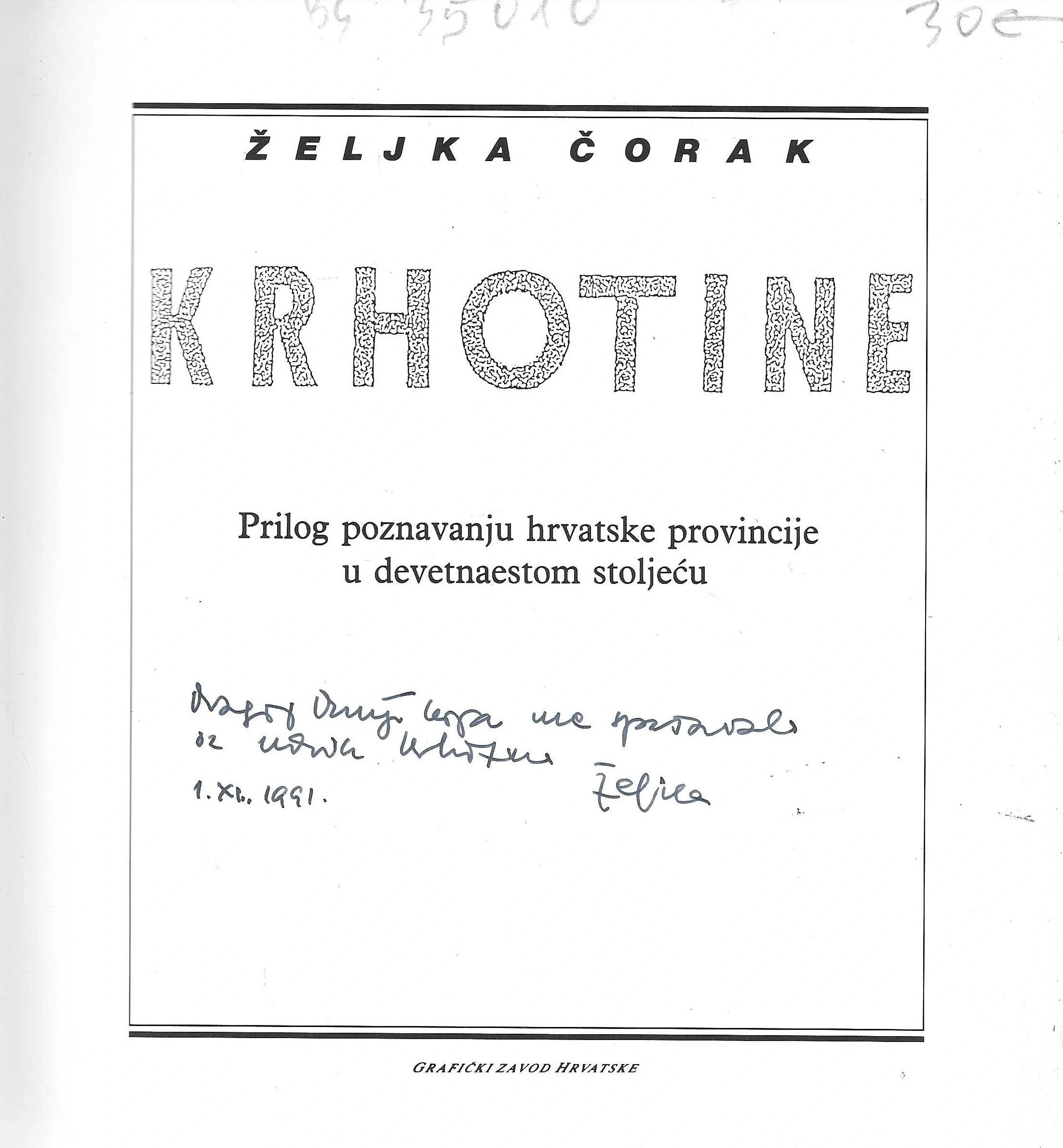 Željka Čorak: Krhotine – prilog poznavanju hrvatske provincije u devetnaestom stoljeću – s potpisom