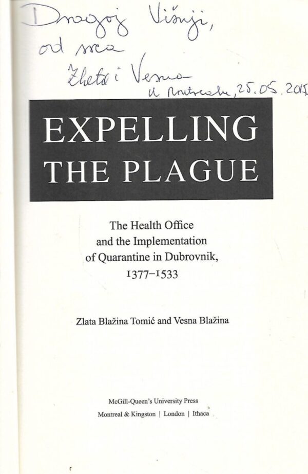 Zlata Blažina Tomić i Vesna Blažina: Expelling the Plague: The Health Office and the Implementation of Quarantine in Dubrovnik 1377– 1533 – s potpisom Zlate Blažine Tomić i Vesne Blažine